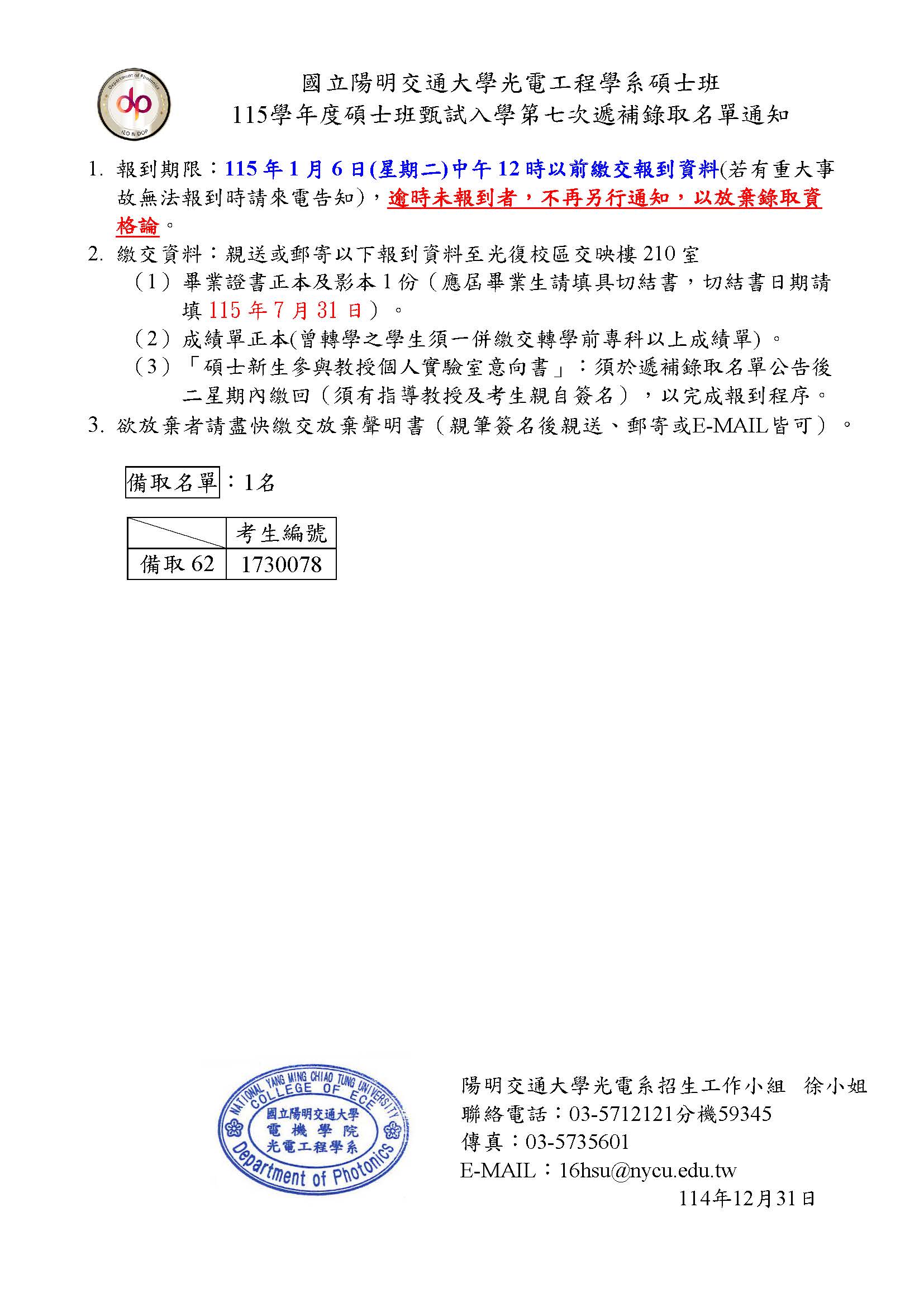 2025-12-31 1141231陽交大光電系碩士班甄試入學確定遞補公告(7)通知 附件檔案115切結書115放棄聲明書1141231遞補名單7 最後修改時間2025-12-31 08:59:16 Back