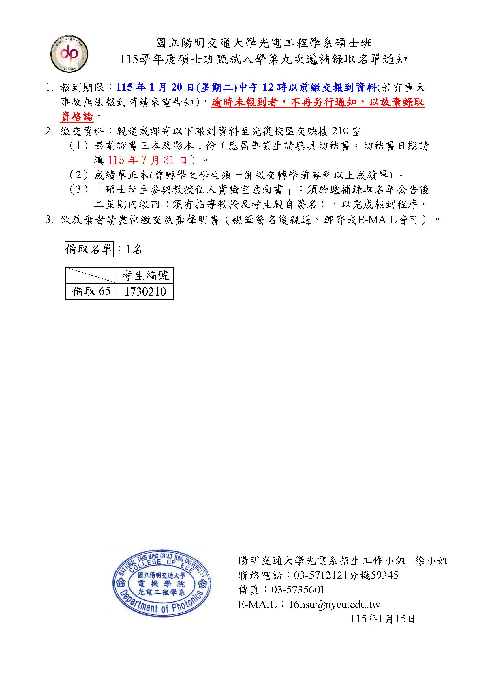 2026-01-15 1150115陽交大光電系碩士班甄試入學確定遞補公告(9)通知 附件檔案115切結書115放棄聲明書1150115遞補名單9 最後修改時間2026-01-15 08:42:04 Back